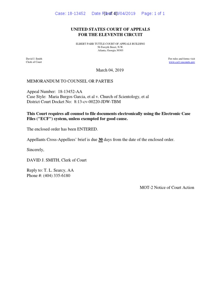 MEMORANDUM TO COUNSEL OR PARTIES Appeal Number: 18-13452-AA Case Style: Maria Burgos Garcia, et al v. Church of Scientology, et al District Court Docket No: 8:13-cv-00220-JDW-TBM