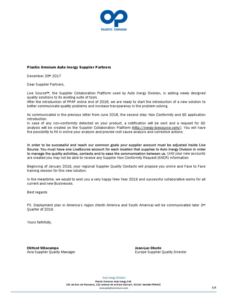 Beginning of January 2018, your regional Supplier Quality Contacts will propose you online and Face to Face