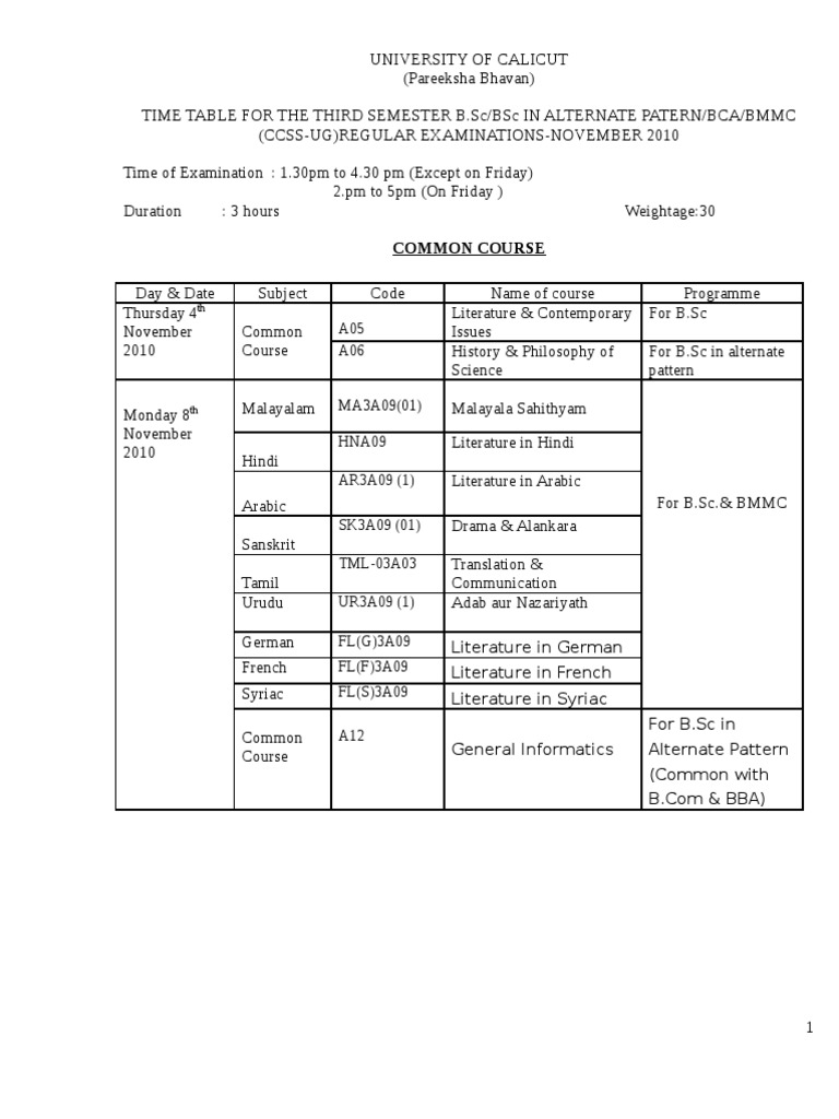 TIME TABLE FOR THE THIRD SEMESTER [Link]/BSc IN ALTERNATE PATERN/BCA/BMMC