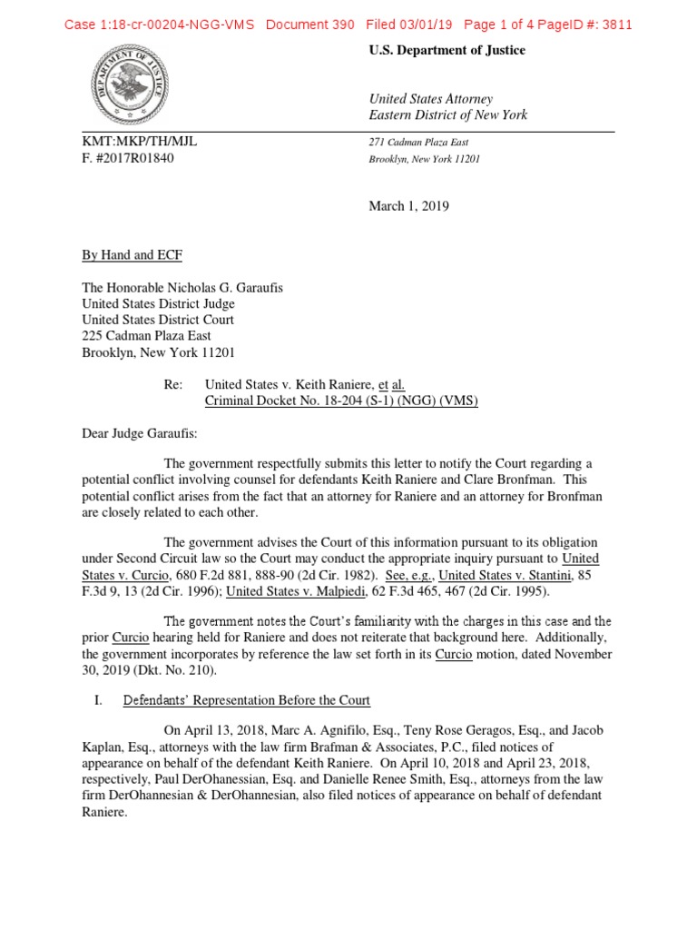 March 1, 2019 By Hand and ECF The Honorable Nicholas G. Garaufis United States District Judge United States District Court 225 Cadman Plaza East Brooklyn, New York 11201 Re: United States v. Keith Raniere, et al. Criminal Docket No. 18-204 (S-1) (NGG) (VMS) Dear Judge Garaufis: The government respectfully submits this letter to notify the Court regarding a potential conflict involving counsel for defendants Keith Raniere and Clare Bronfman. This potential conflict arises from the fact that an attorney for Raniere and an attorney for Bronfman are closely related to each other. The government advises the Court of this information pursuant to its obligation under Second Circuit law so the Court may conduct the appropriate inquiry pursuant to United States v. Curcio, 680 F.2d 881, 888-90 (2d Cir. 1982). See, e.g., United States v. Stantini, 85 F.3d 9, 13 (2d Cir. 1996); United States v. Malpiedi, 62 F.3d 465, 467 (2d Cir. 1995).