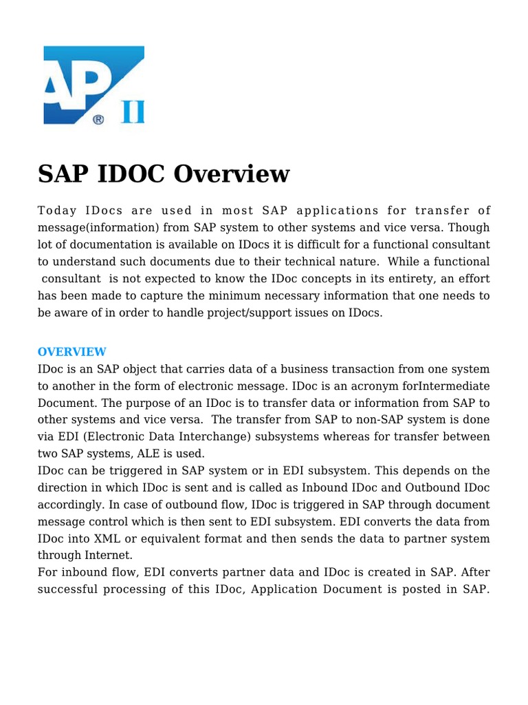 to another in the form of electronic message. IDoc is an acronym forIntermediate
