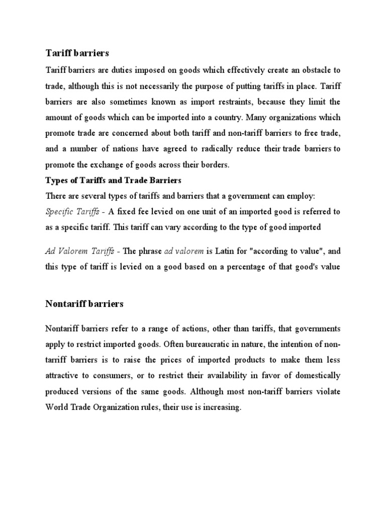 Tariff barriers are duties imposed on goods which effectively create an obstacle to