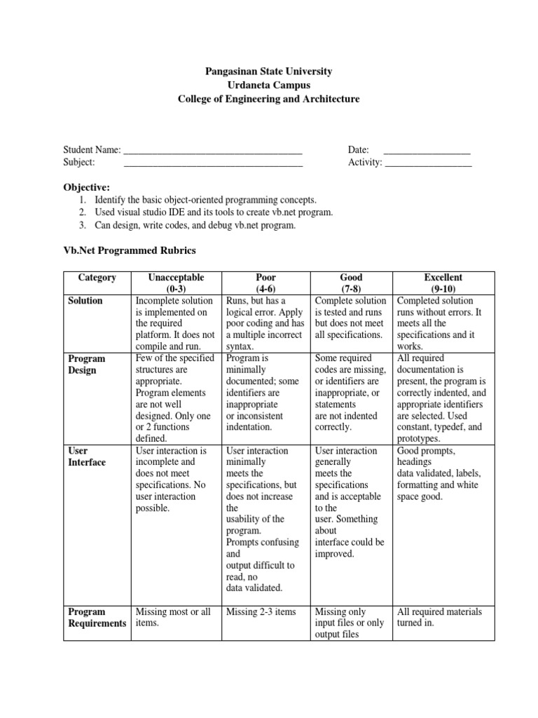 Vb.Net Programmed Rubrics