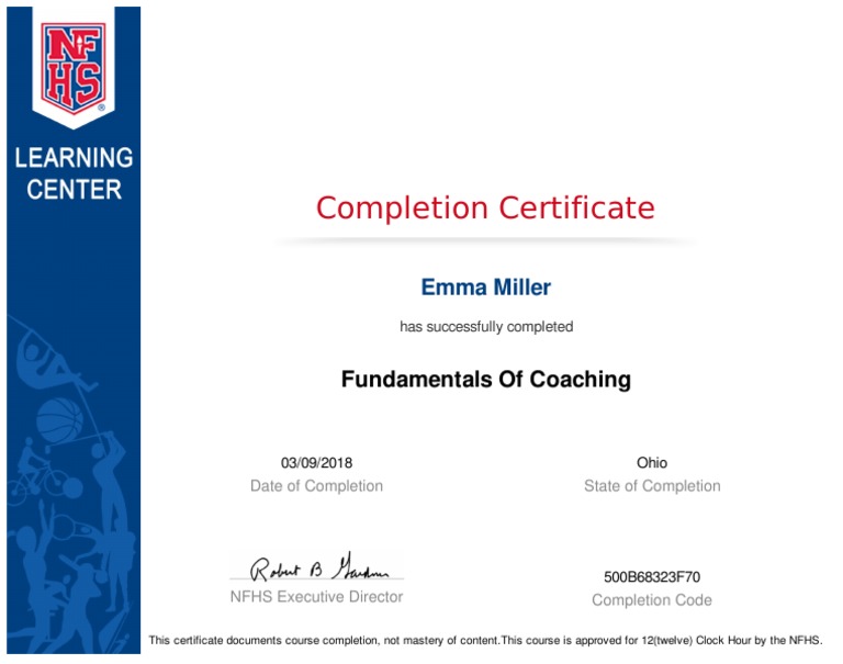 This certificate documents course completion, not mastery of content.This course is approved for 12(twelve) Clock Hour by the NFHS.