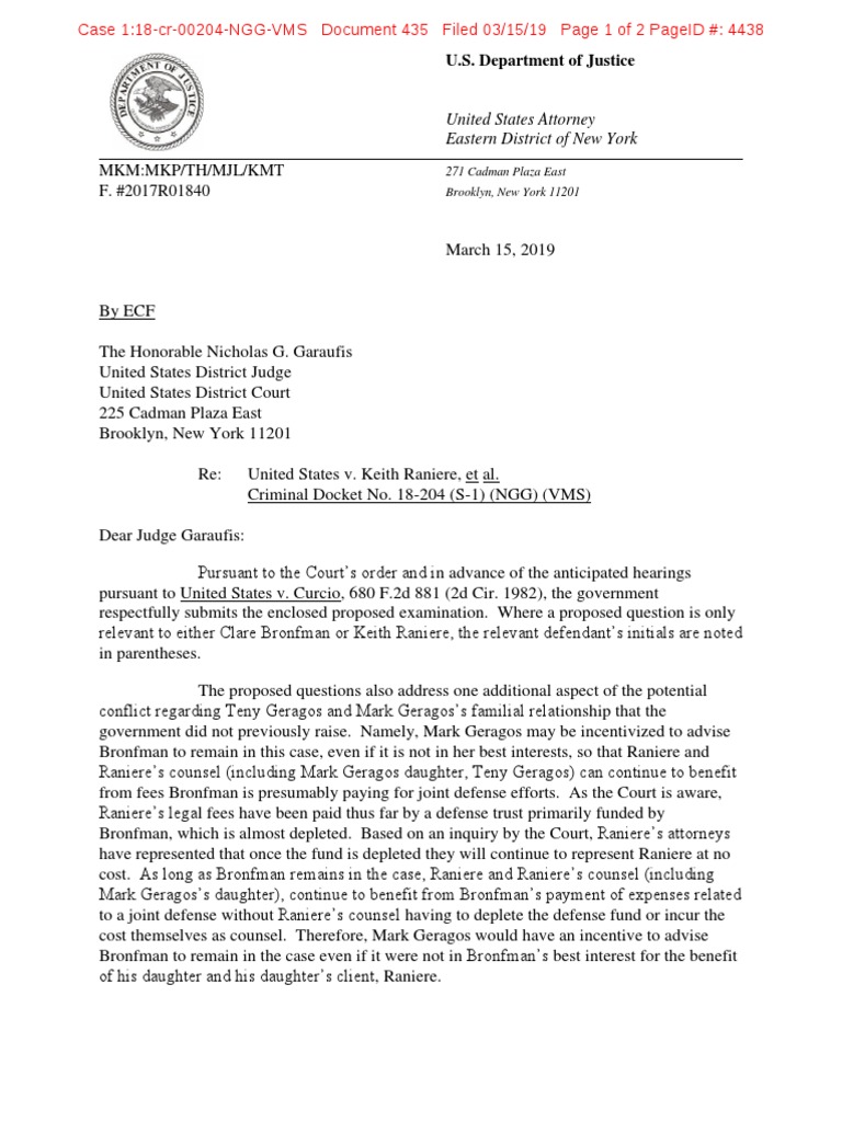 March 15, 2019 By ECF The Honorable Nicholas G. Garaufis United States District Judge United States District Court 225 Cadman Plaza East Brooklyn, New York 11201 Re: United States v. Keith Raniere, et al. Criminal Docket No. 18-204 (S-1) (NGG) (VMS) Dear Judge Garaufis: