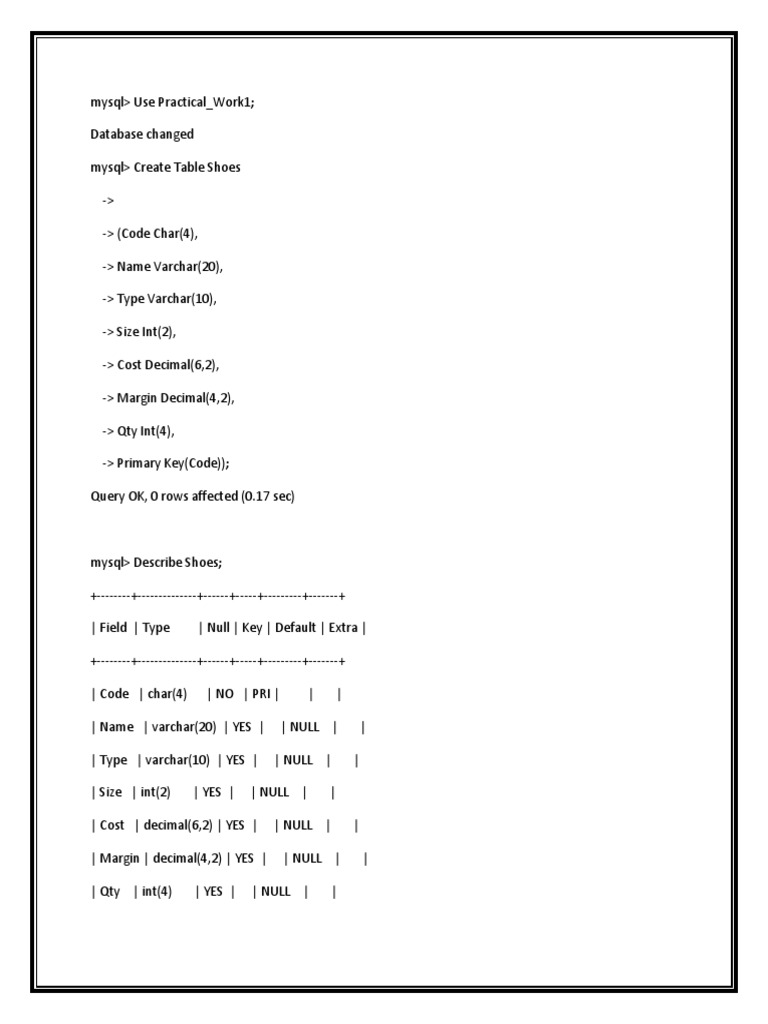 mysql> Insert into Shoes Values("1012","School Leather","School",7,270.00,2,1280);