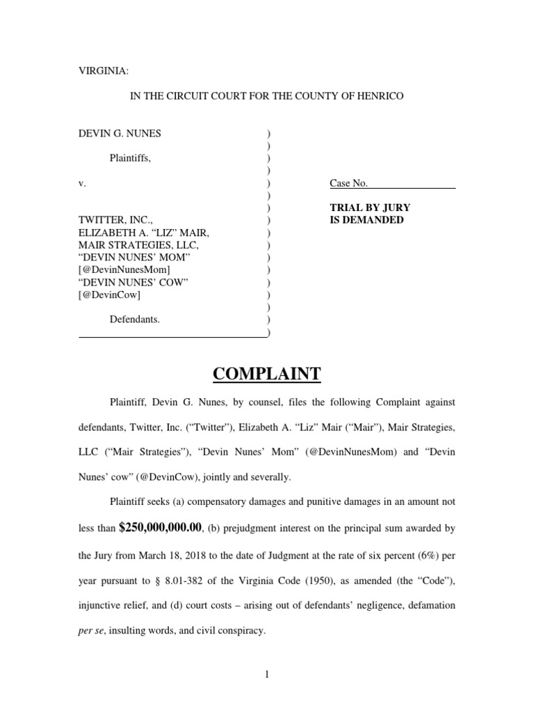 Plaintiff, Devin G. Nunes, by counsel, files the following Complaint against defendants, Twitter, Inc. (“Twitter”), Elizabeth A. “Liz” Mair (“Mair”), Mair Strategies, LLC (“Mair Strategies”), “Devin Nunes’ Mom” (@DevinNunesMom) and “Devin Nunes’ cow” (@DevinCow), jointly and severally. Plaintiff seeks (a) compensatory damages and punitive damages in an amount not less than