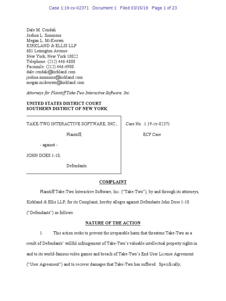 TAKE-TWO INTERACTIVE SOFTWARE, INC., Case No. 1:19-cv-02371