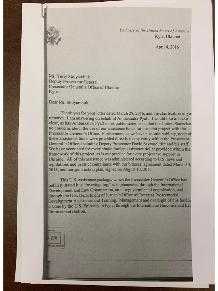 Letter from US embassy to Ukraine general prosecutor about concerns over misprision of funds probe