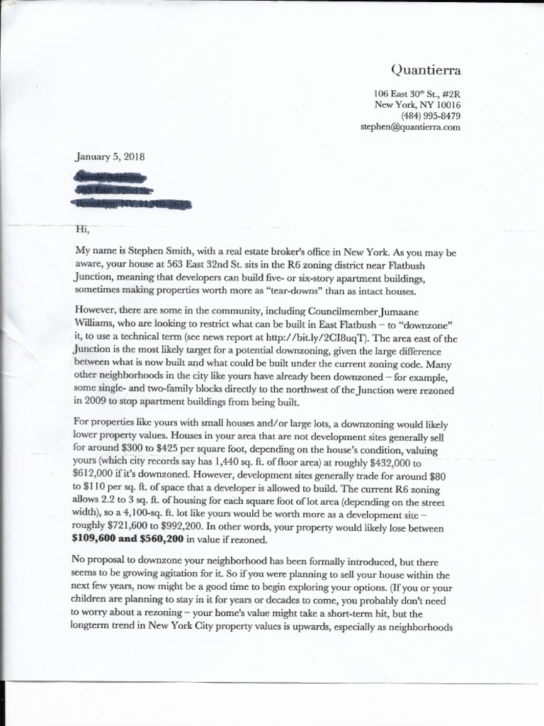 Residents received letters suggesting homeowners sell now before they experience a "short-term" hit because of downzoning. The author delves into the complexities of rezoning and namedrops Public Advocate Jumaane Williams, a former councilman in the district.