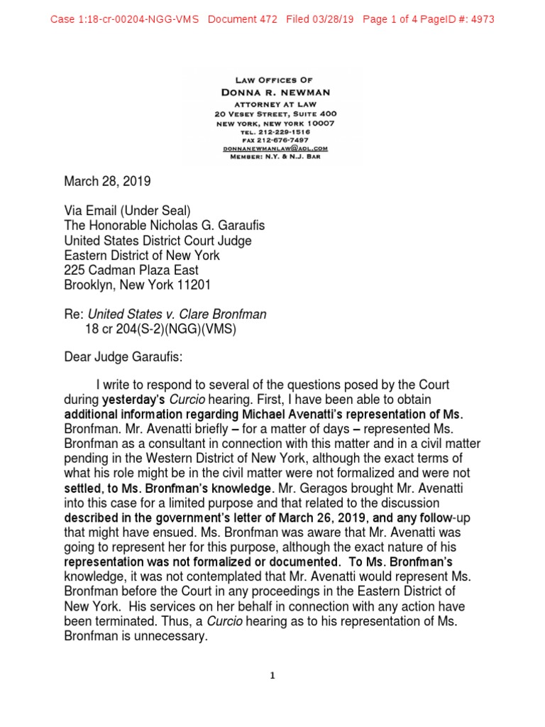 knowledge, it was not contemplated that Mr. Avenatti would represent Ms. Bronfman before the Court in any proceedings in the Eastern District of New York. His services on her behalf in connection with any action have been terminated. Thus, a