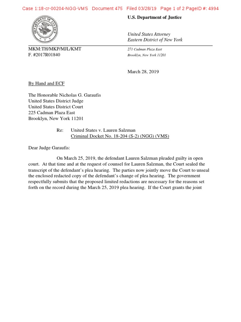 March 28, 2019 By Hand and ECF The Honorable Nicholas G. Garaufis United States District Judge United States District Court 225 Cadman Plaza East Brooklyn, New York 11201 Re: United States v. Lauren Salzman Criminal Docket No. 18-204 (S-2) (NGG) (VMS) Dear Judge Garaufis: On March 25, 2019, the defendant Lauren Salzman pleaded guilty in open court. At that time and at the request of counsel for Lauren Salzman, the Court sealed the transcript of the defendant’s plea hearing. The parties now jointly move the Court to unseal the enclosed redacted copy of the defendant’s change of plea hearing. The government respectfully submits that the proposed limited redactions are necessary for the reasons set forth on the record during the March 25, 2019 plea hearing. If the Court grants the joint