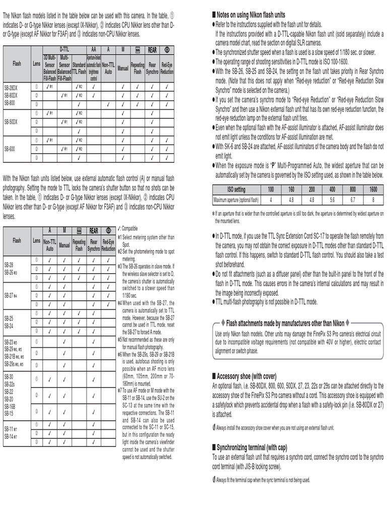 3 ✓ ✓ ✓ ✓ the SB-27 to forced A mode. Use only Nikon flash models. Other units may damage the FinePix S3 Pro camera’s electrical circuit
