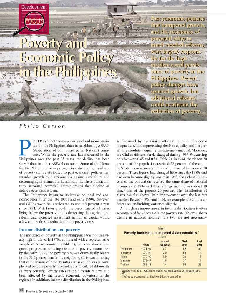 poverty in the Philippines. Indeed, between 1970 and 1995, Overvaluation of the peso, tariff policies, and heavy gov-
