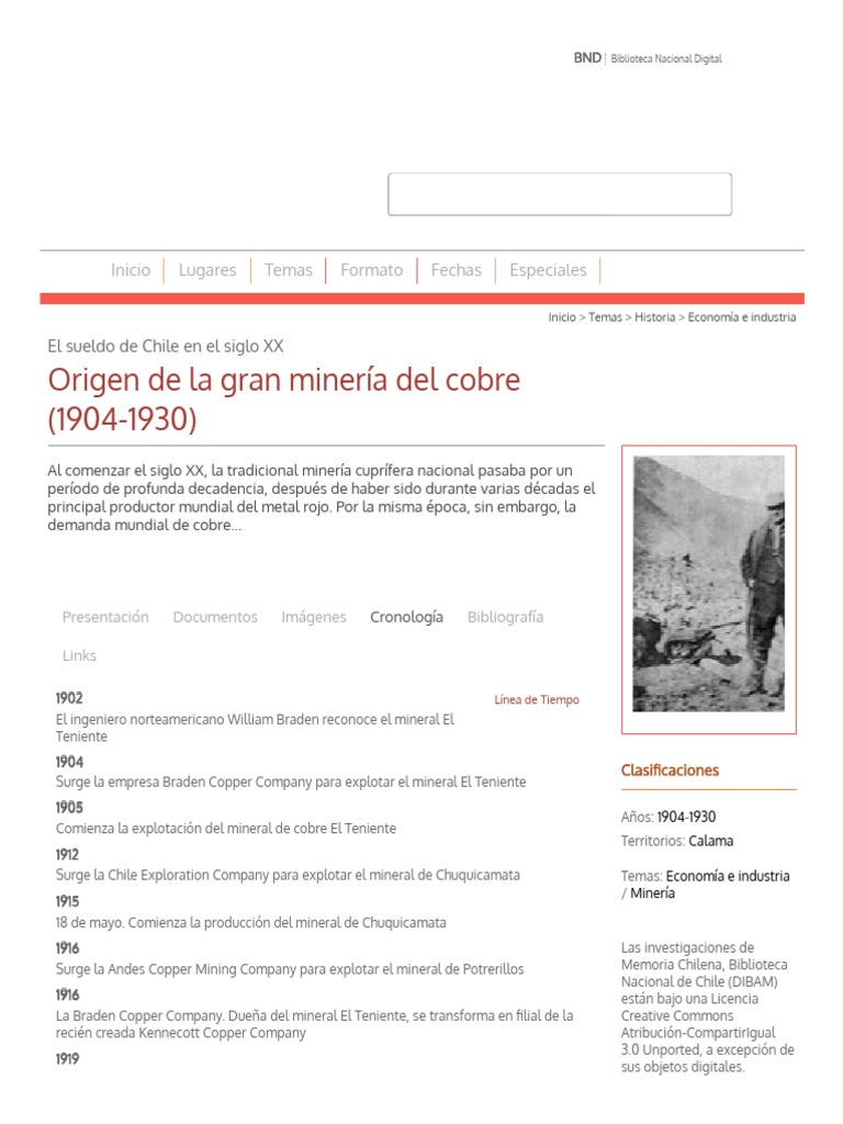 El ingeniero norteamericano William Braden reconoce el mineral El Teniente 1904 Clasi caciones Surge la empresa Braden Copper Company para explotar el mineral El Teniente 1905 Años: 1904-1930 Comienza la explotación del mineral de cobre El Teniente Territorios: Calama 1912 Surge la Chile Exploration Company para explotar el mineral de Chuquicamata Temas: Economía e industria / Minería 1915 18 de mayo. Comienza la producción del mineral de Chuquicamata 1916 Las investigaciones de Surge la Andes Copper Mining Company para explotar el mineral de Potrerillos Memoria Chilena, Biblioteca Nacional de Chile (DIBAM) 1916 están bajo una Licencia La Braden Copper Company. Dueña del mineral El Teniente, se transforma en lial de la Creative Commons recién creada Kennecott Copper Company Atribución-CompartirIgual 3.0 Unported, a excepción de 1919 sus objetos digitales. 21 de septiembre. Se declara la primera huelga en el mineral El Teniente 1923 La familia Guggenheim vende el yacimiento de Chuquicamata a la Anaconda Copper Company Ltd. 1927 Comienza la producción del mineral de Potrerillos