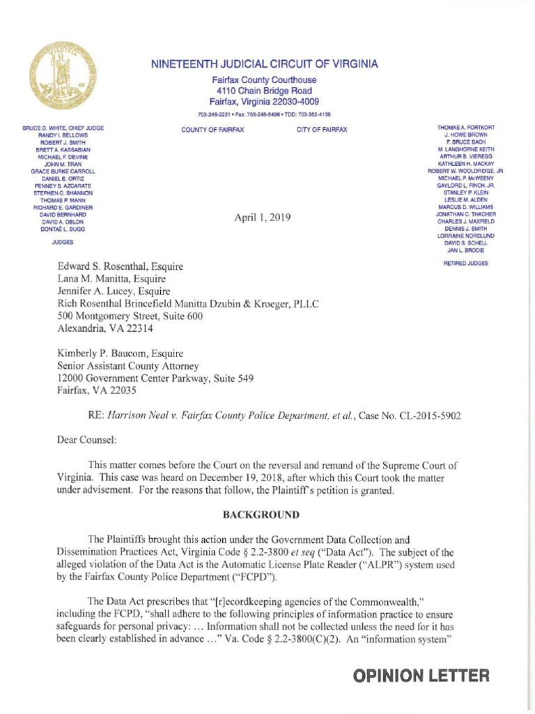RE: Harrison Neal v. Fairfax County Police Department, et al., Case No. CL-2015-5902