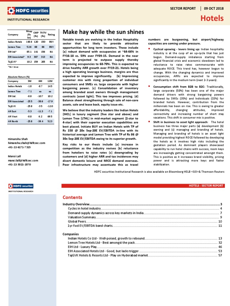 EIH Ltd* 85.1 141 156 NA (a) robust demand with occupancies at ~64-66% in industry is at the cusp of an up-cycle that has just