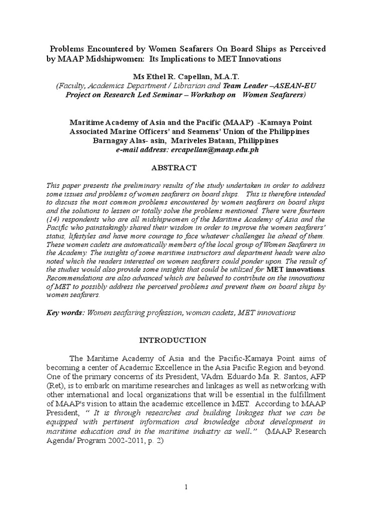 some issues and problems of women seafarers on board ships. This is therefore intended