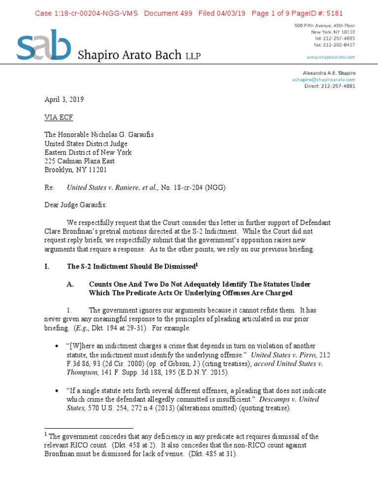 , No. 18-cr-204 (NGG) Dear Judge Garaufis: We respectfully request that the Court consider this letter in further support of Defendant Clare Bronfman’s pretrial motions directed at the S-2 Indictment. While the Court did not request reply briefs, we respectfully submit that the government’s opposition raises new arguments that require a response. As to the other points, we rely on our previous briefing.