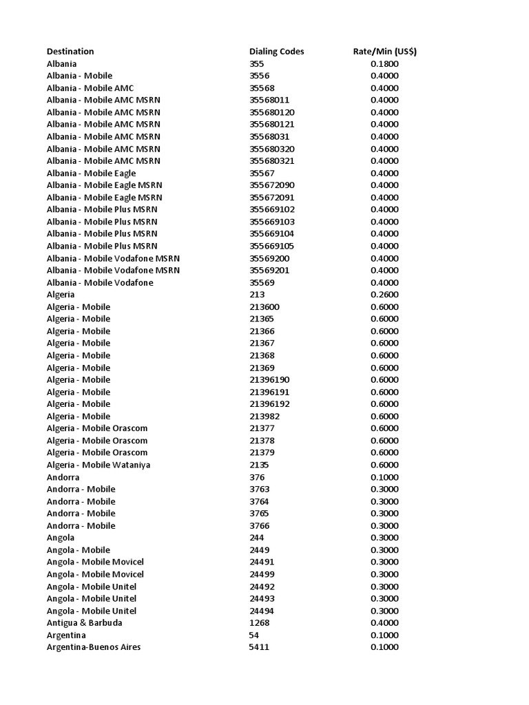 Destination Dialing Codes Rate/Min (US$)