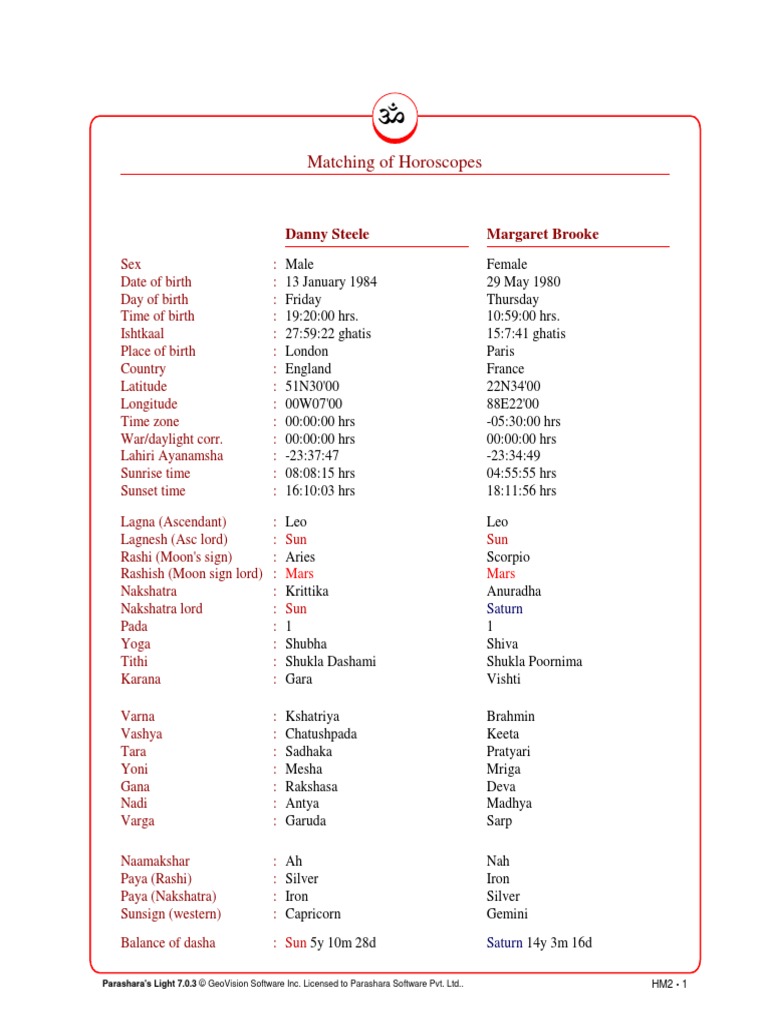 • The Lagna of Danny Steele falls in the same Nakshatra as Lagna of Margaret Brooke. • The Rahu of Danny