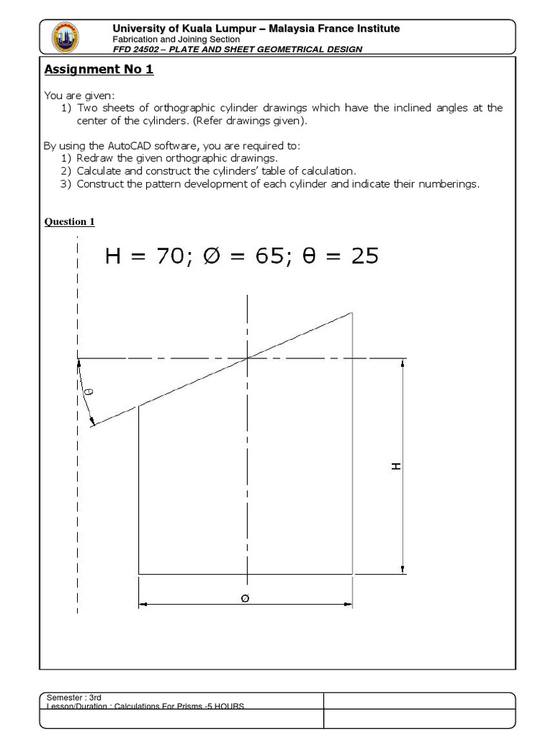 1) Two sheets of orthographic cylinder drawings which have the inclined angles at the