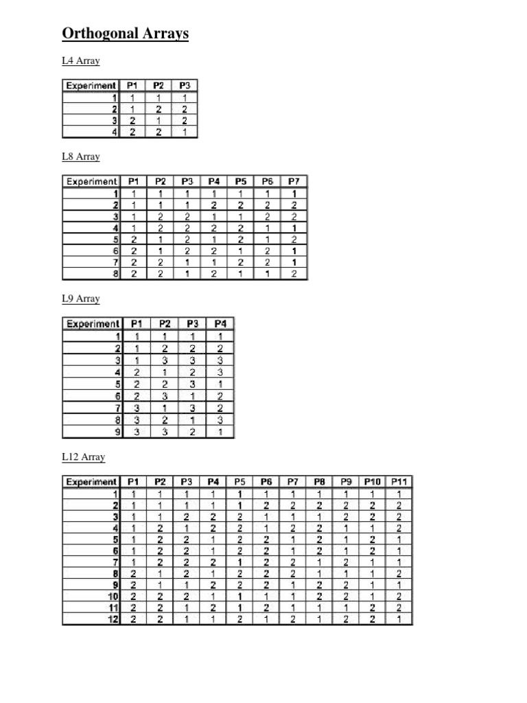This document discusses various orthogonal arrays used in design of experiments, including L4, L8, L9, L12, L16, L'16, L18, L25, L27, L32, L'32, L36, and L50 arrays. Orthogonal arrays are experimental designs used to study multiple factors, each with different levels, using fewer experimental runs. The document lists the number of factors and levels that can be studied using each orthogonal array design.