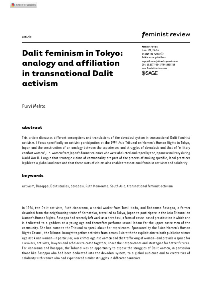 Mehta, P., 2017. Dalit feminism at home and in the world: the work of ‘difference’ and ‘similarity’ in national and transnational