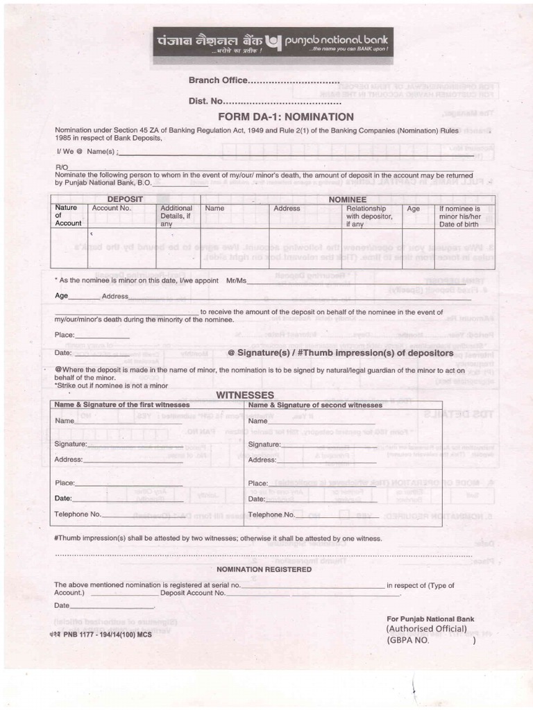 Nomination under Section 45ZA of Banking Regulation Act, 1949 and Rule 2(1) of the Banking Companies (Nomination) Rules