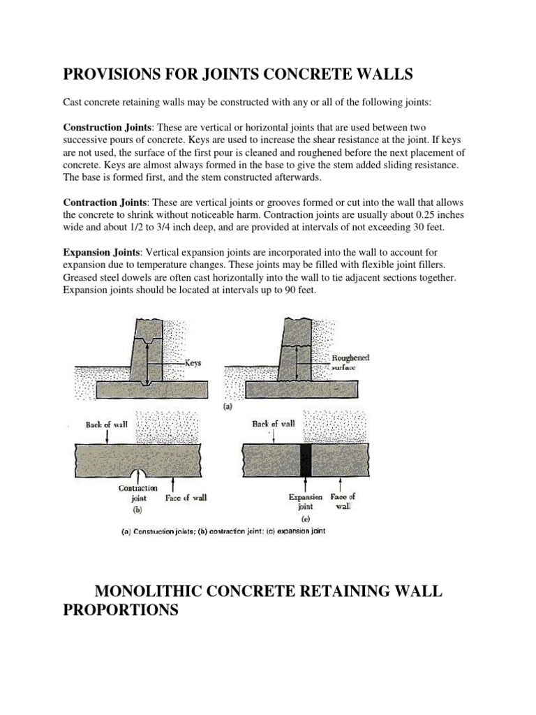 Cast concrete retaining walls may be constructed with any or all of the following joints: