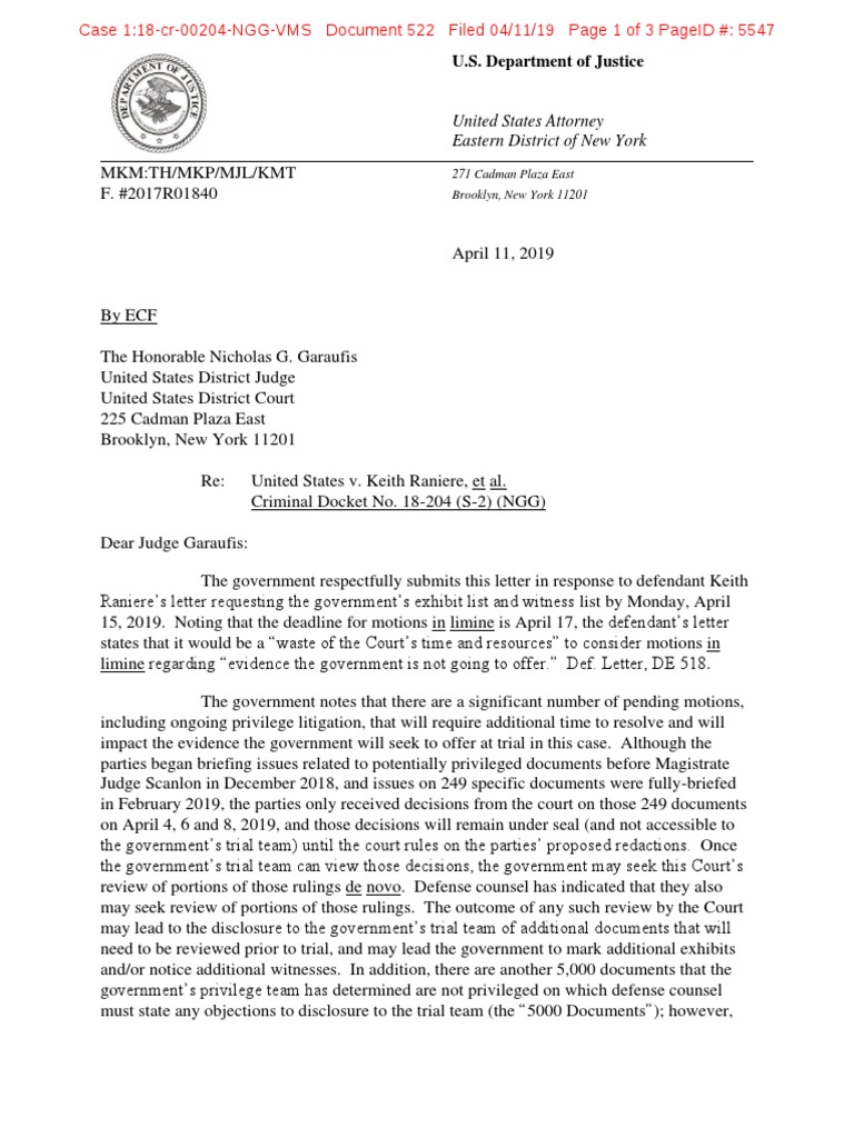 April 11, 2019 By ECF The Honorable Nicholas G. Garaufis United States District Judge United States District Court 225 Cadman Plaza East Brooklyn, New York 11201 Re: United States v. Keith Raniere, et al. Criminal Docket No. 18-204 (S-2) (NGG) Dear Judge Garaufis: The government respectfully submits this letter in response to defendant Keith