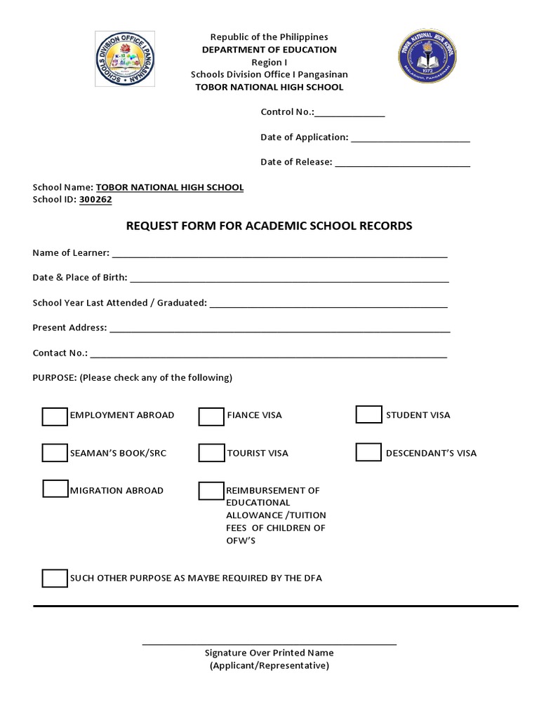 REQUEST FORM FOR ACADEMIC SCHOOL RECORDS