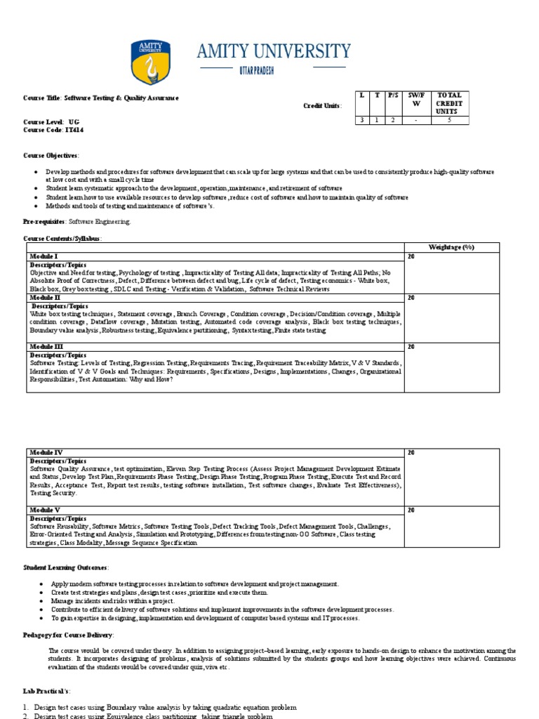 Course Title: Software Testing & Quality Assurance L T P/S SW/F TOTAL