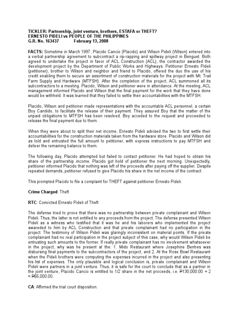 TICKLER: Partnership, joint venture, brothers, ESTAFA or THEFT?