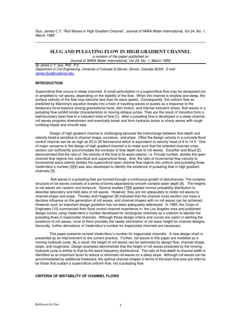 Guo, James C.Y. “Roll Waves in High Gradient Channel”, Journal of IWRA Water International, Vol 24, No.