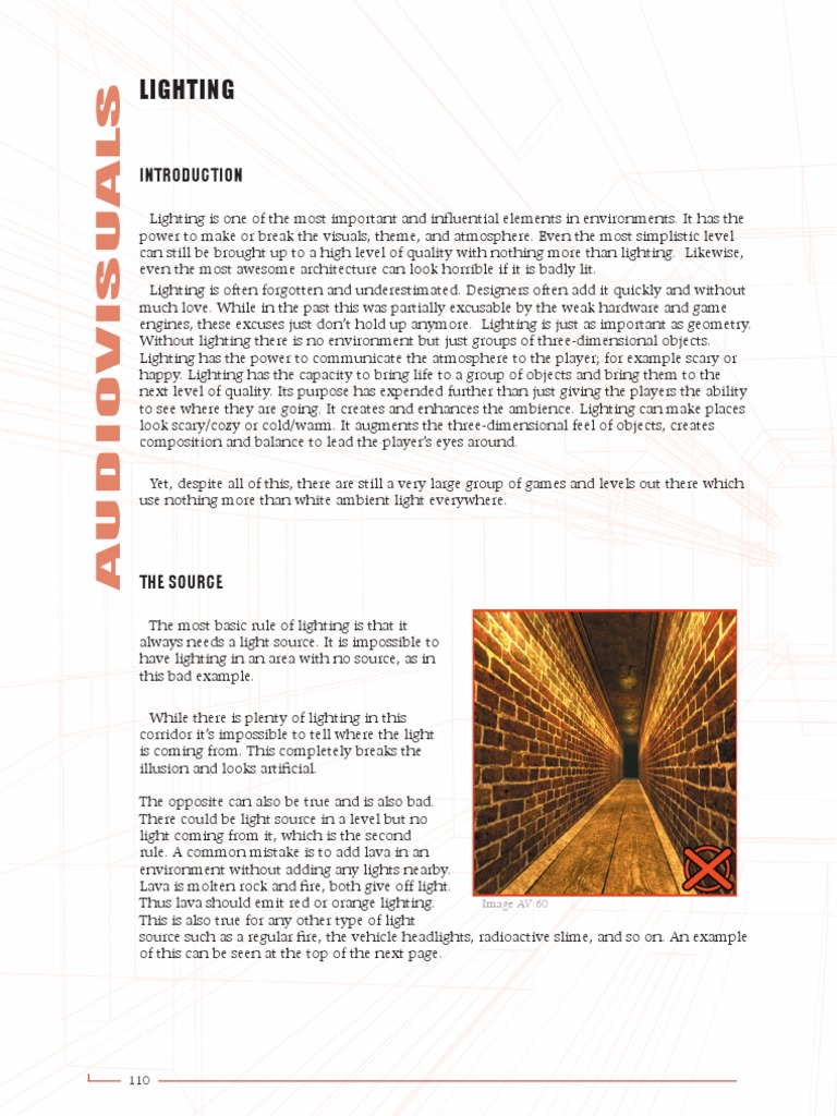 Similarly, the player should see exactly where the light is coming from. The area near asource should appear the brightest.The left image is bad because the entire corridor has an equal brightness, which is strange.It doesn’t feel like the light is really coming from the lamps. The light should be considerablybrighter near the source rather than ten meters further away in a corner. Its brightness shouldfade as it travels further and further away from the source. The light should show variationin brightness as it travels. This is not only more realistic but it also helps the lightingcomposition. Show a direct influence on one element from another!If there are multiple identical light sources in a row, such as the lamps in a corridor above,it can help to give some of the lights a slightly different color or brightness to add additionalvariation.