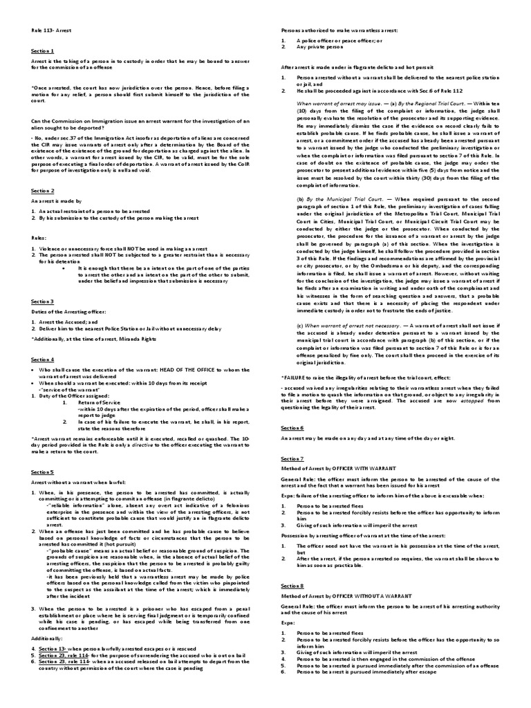 6. Section 23, rule 114- when an accused released on bail attempts to depart from the 4. Person to be arrested is then engaged in the commission of the offense