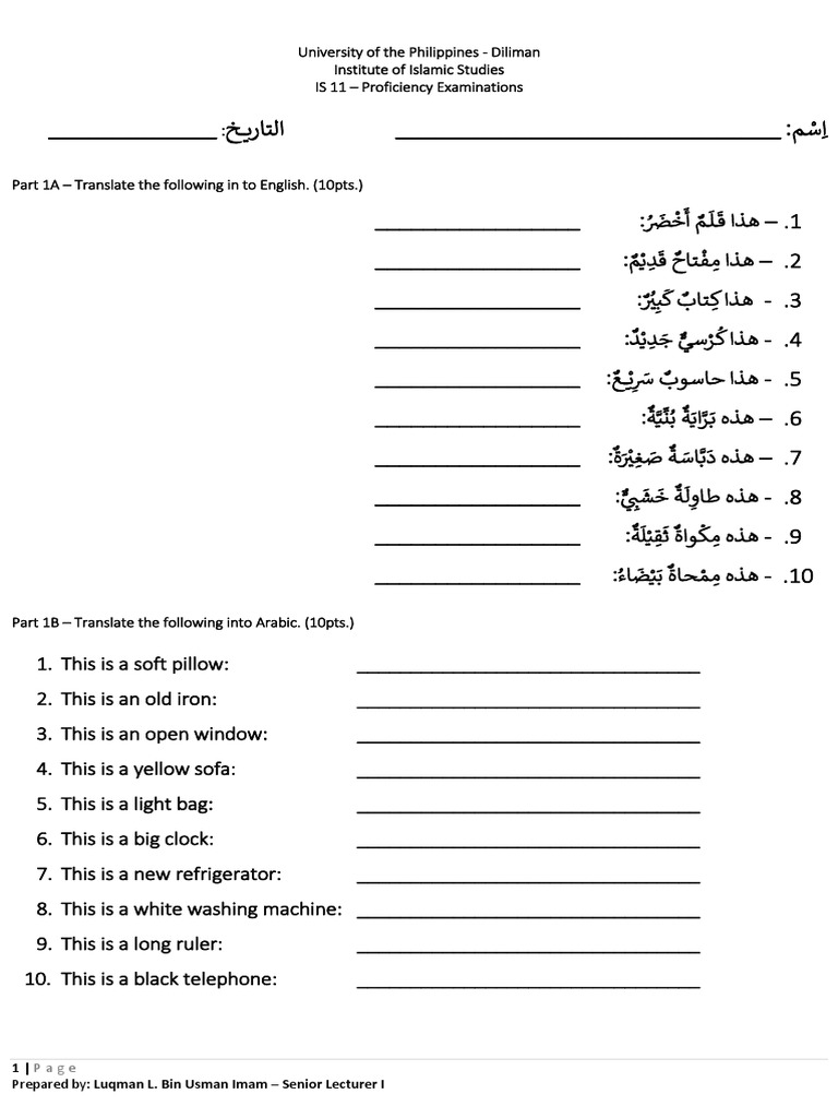 Part 2C – Write five (5) sentences about yourself using Arabic Language. [10pts]