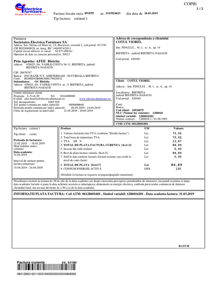 INFORMATII PLATA FACTURA: Cod ATM: 06128601601 , Simbol variabil: 1286016201 , Data scadenta factura: 31.03.2019