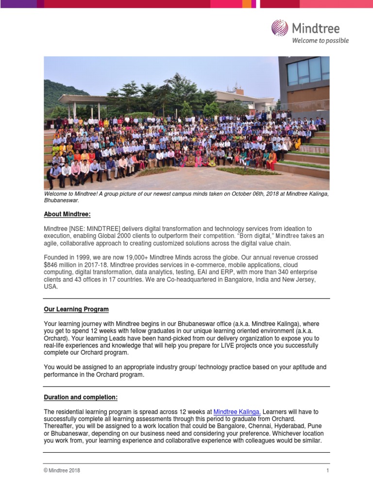 Your learning journey with Mindtree begins in our Bhubaneswar office (a.k.a. Mindtree Kalinga), where
