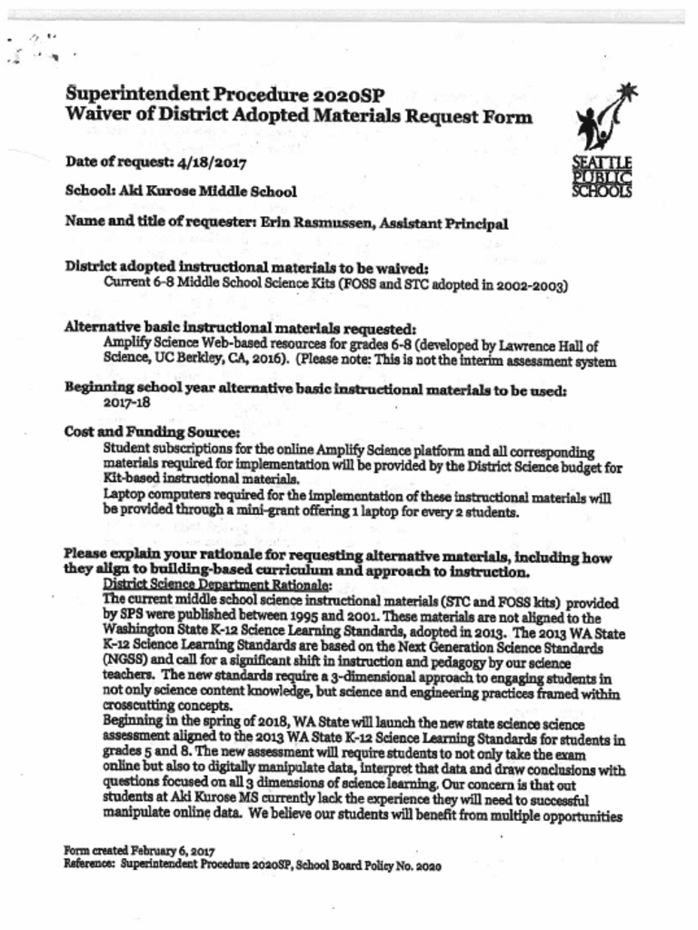 Seattle Public Schools Curriculum Waiver Forms For Use of Amplify Science, April 2017