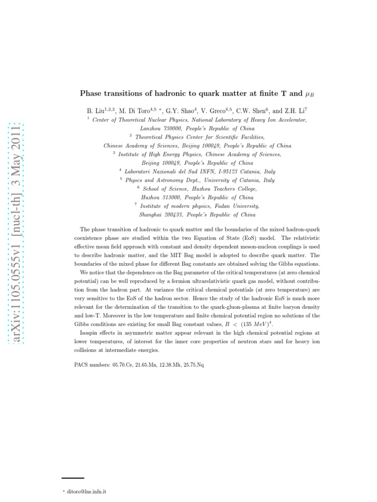In Ref. [3] the phase transition from hadron to quark matter has been firstly analyzed also for isospin