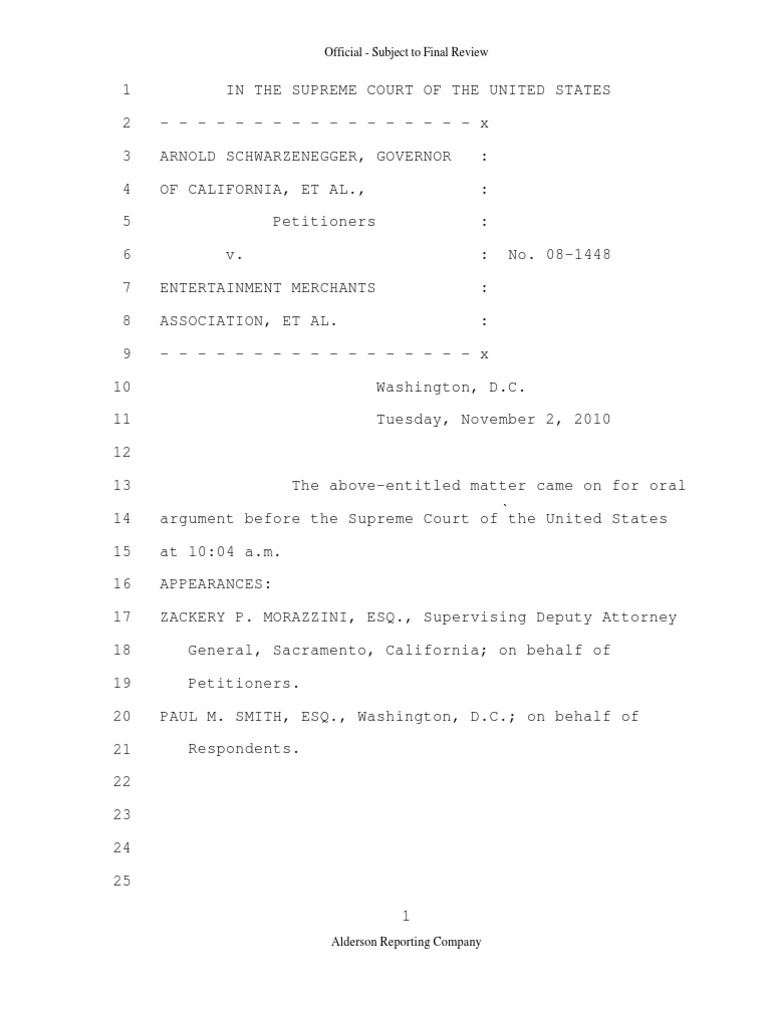 (Source: U.S. Supreme Court) Supreme Court transcript of Schwarzenegger v. Entertainment Merchants Association