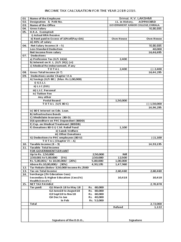 INCOME TAX CALCULATION FOR THE YEAR 2018-2019.