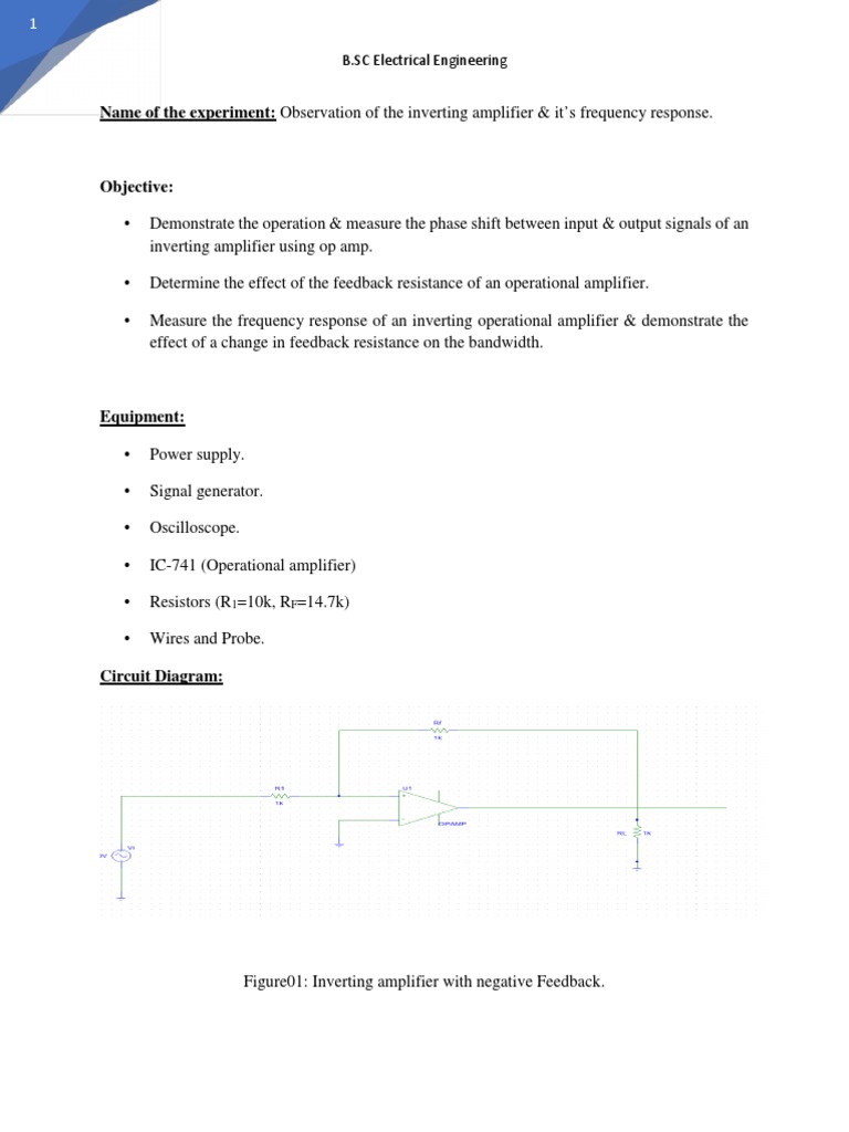 The experiment is on observation of the inverting amplifier and its frequency response. For this
