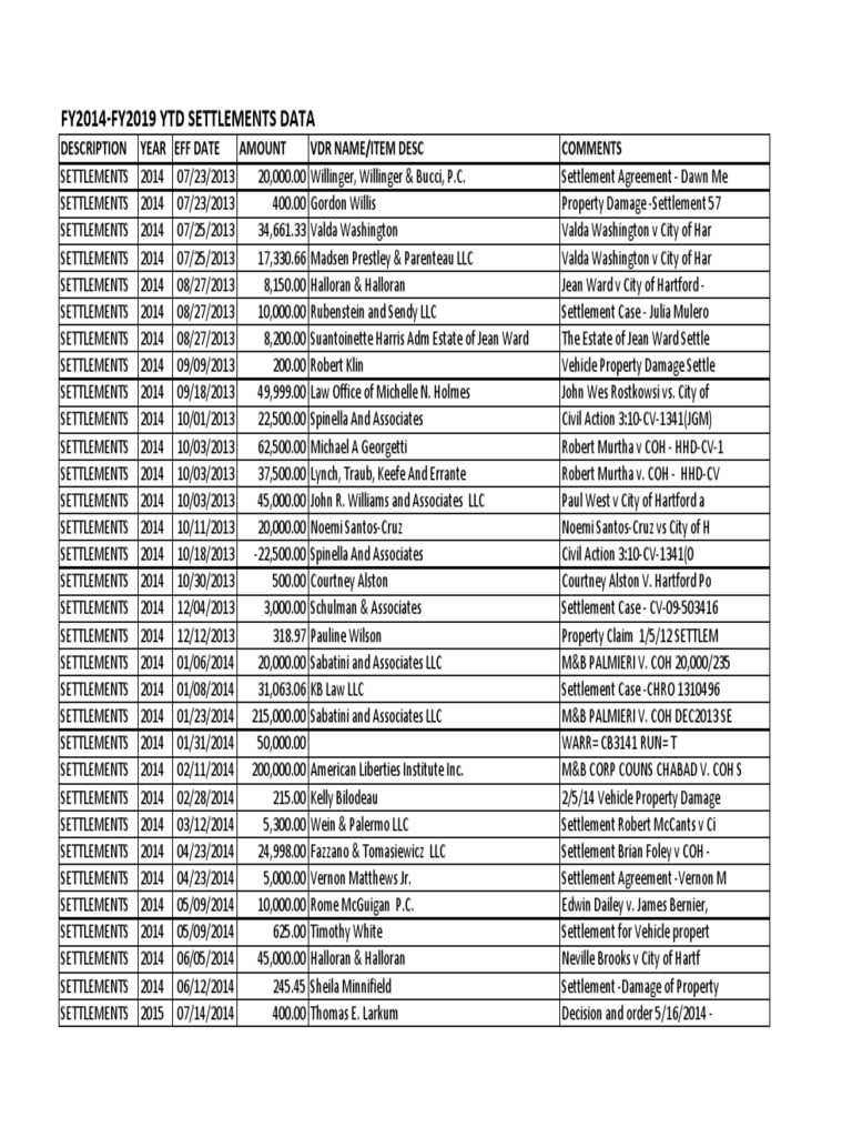 CITY OF HARTFORD SETTLEMENTS 2014 TO 2019