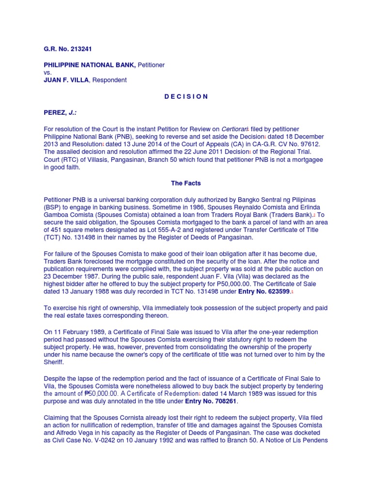 Court (RTC) of Villasis, Pangasinan, Branch 50 which found that petitioner PNB is not a mortgagee