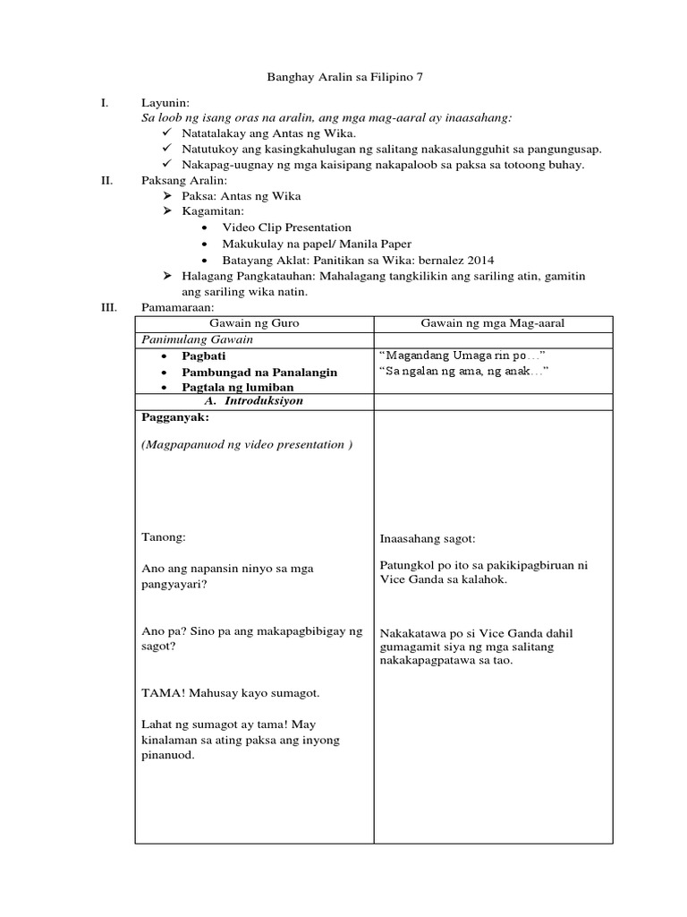 Banghay Aralin sa Filipino 7