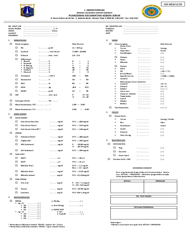 * Pemeriksaan dilakukan setelah “PUASA” selama 10 – 12 jam *Silahkan coret salah satu pada kata SETUJU / MENOLAK