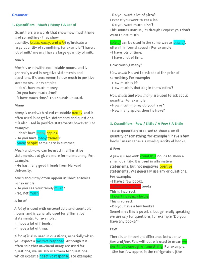 1. Quantifiers - Much / Many / A Lot of - Do you want much pizza?